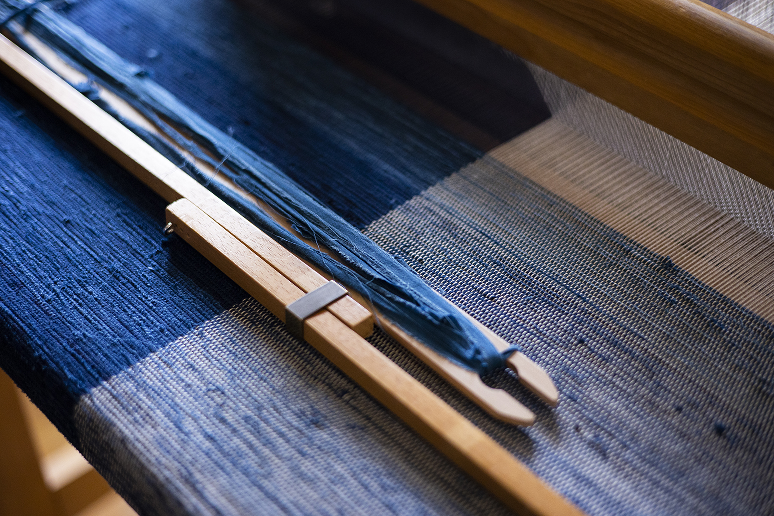 藍染やりんご染め・草木染等、染色技術を用いて布を染め、裂いて横糸にします。横糸を割く幅や織り込みの力加減で様々な触感の裂織を生み出すことができます。